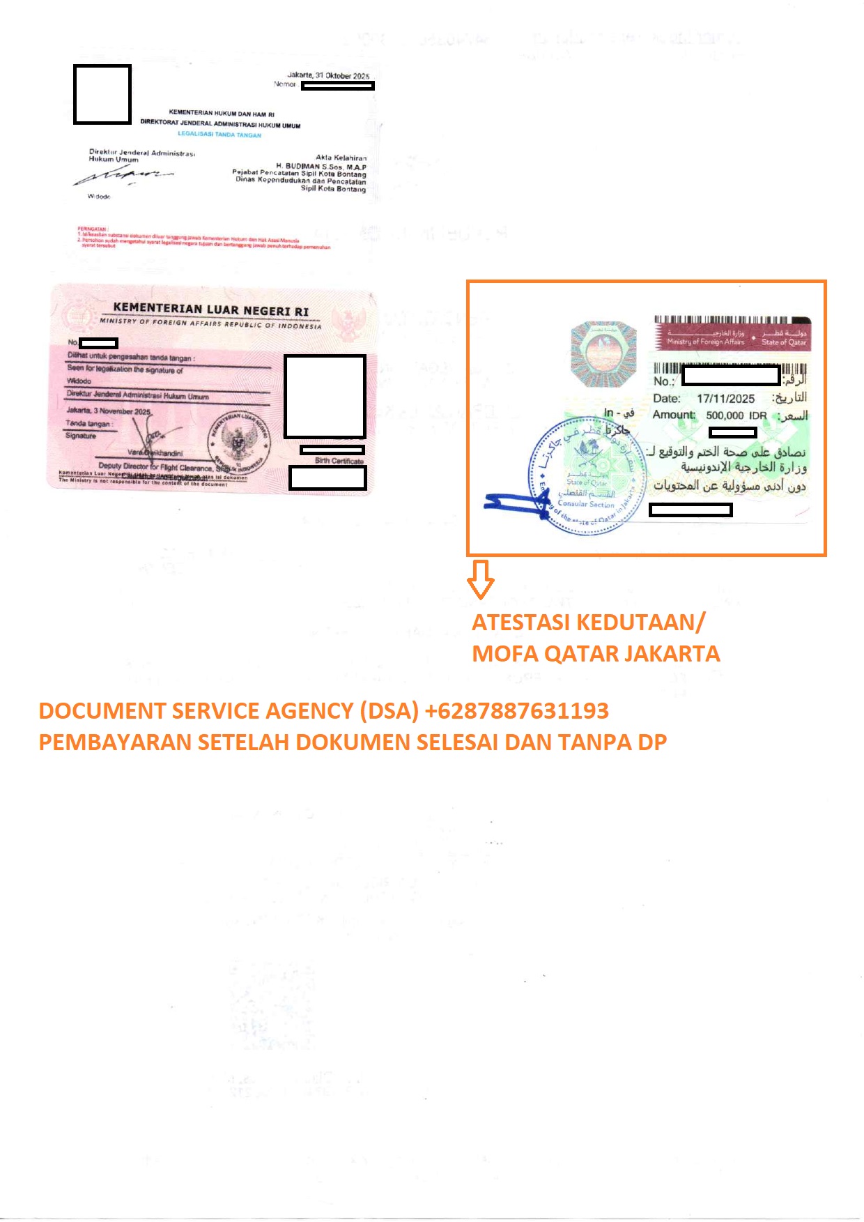 DSA (Document Service Agency) adalah spesialis jasa terjemah, legalisir, atestasi, apostile dokumen untuk keperluan di luar negeri dan pengurusan visa berpengalaman dan terpercaya. Bagi anda yang ingin melegalisir akta kelahiran di Kedutaan Qatar untuk keperluan bekerja, pengurusan visa, izin tinggal, dan lain-lain. Percayakan legalisir dokumen anda kepada kami, dengan layanan ” Pembayaran Setelah Dokumen Selesai dan Tanpa DP ” anda akan merasa lebih nyaman dan aman menggunakan jasa kami. Dan dalam hitungan beberapa hari dokumen anda selesai dan siap untuk digunakan.