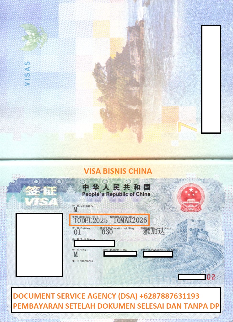 DSA (Document Service Agency) adalah spesialis jasa terjemah, legalisir, atestasi, apostile dokumen untuk keperluan di luar negeri dan pengurusan visa berpengalaman dan terpercaya. Bagi anda yang ingin mngurus visa di Kedutaan China untuk keperluan liburan, bisnis, bekerja, berlayar, ikut pasangan dan lain-lain. Anda tidak perlu datang ke Jakarta karna pengurusan visa anda bisa diwakilkan kepada kami, dengan layanan ” Pembayaran Setelah Dokumen Selesai dan Tanpa DP ” membuat anda lebih nyaman dan aman menggunakan jasa kami.