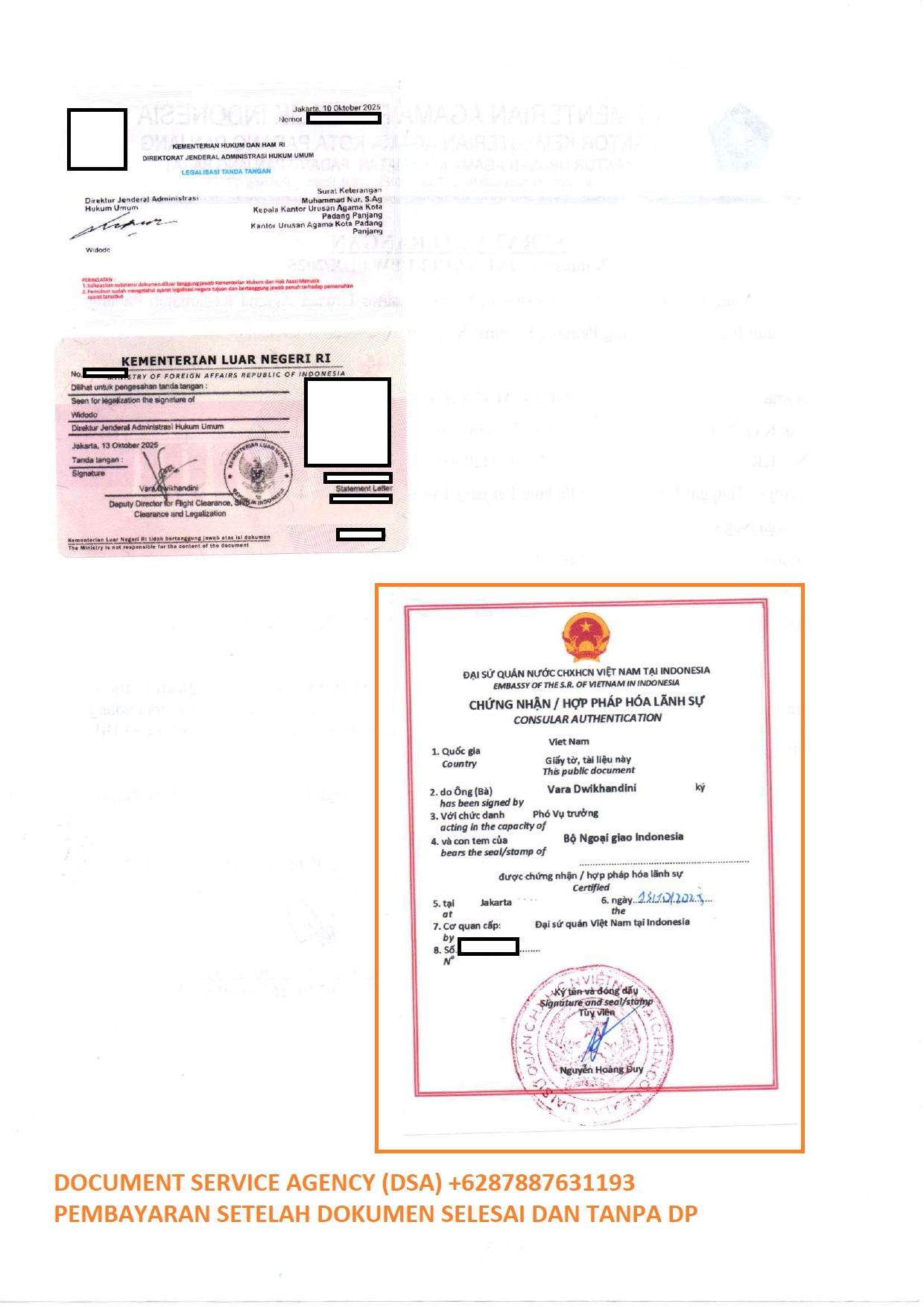 DSA (Document Service Agency) adalah spesialis jasa terjemah, legalisir, atestasi, apostile dokumen untuk keperluan di luar negeri dan pengurusan visa berpengalaman dan terpercaya. Bagi anda yang ingin melegalisir buku nikah di Kedutaan Vietnam untuk keperluan pengurusan visa, izin tinggal, pendaftaran pernikahan dan lain-lain. Anda tidak perlu datang ke Jakarta karna pengurusan dokumen anda bisa diwakilakan kepada kami, dengan layanan ” Pembayaran Setelah Dokumen Selesai dan Tanpa DP ” membuat anda lebih nyaman dan aman menggunakan jasa kami.