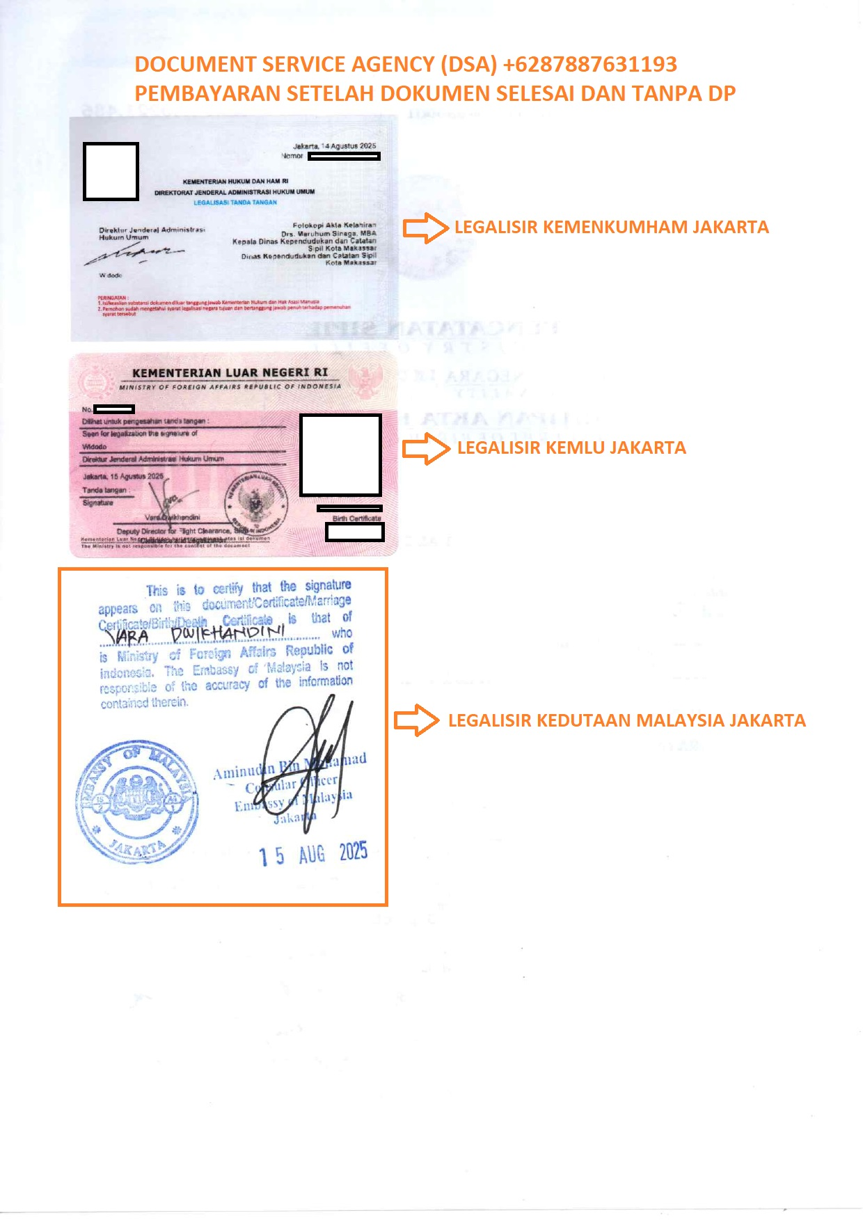 DSA (Document Service Agency) adalah spesialis jasa terjemah, legalisir, atestasi, apostile dokumen untuk keperluan di luar negeri dan pengurusan visa berpengalaman dan terpercaya. Bagi anda yang ingin melegalisir akta kelahiran di Kedutaan Malaysia untuk keperluan pengurusan visa, izin tinggal, pendaftaran pernikahan dan lain-lain. Anda tidak perlu datang ke Jakarta karna pengurusan dokumen anda bisa diwakilakan kepada kami, dengan layanan ” Pembayaran Setelah Dokumen Selesai dan Tanpa DP ” membuat anda lebih nyaman dan aman menggunakan jasa kami.