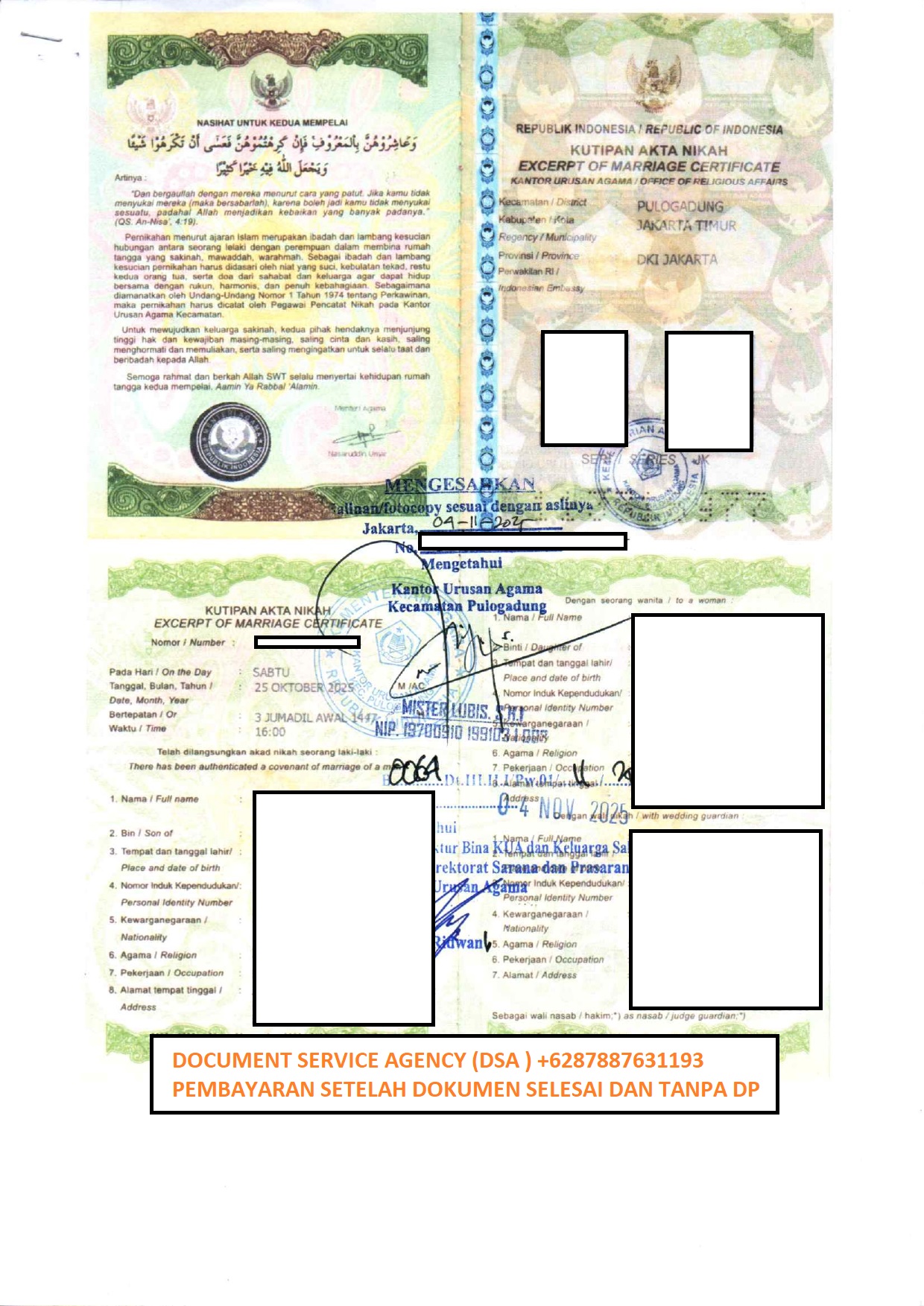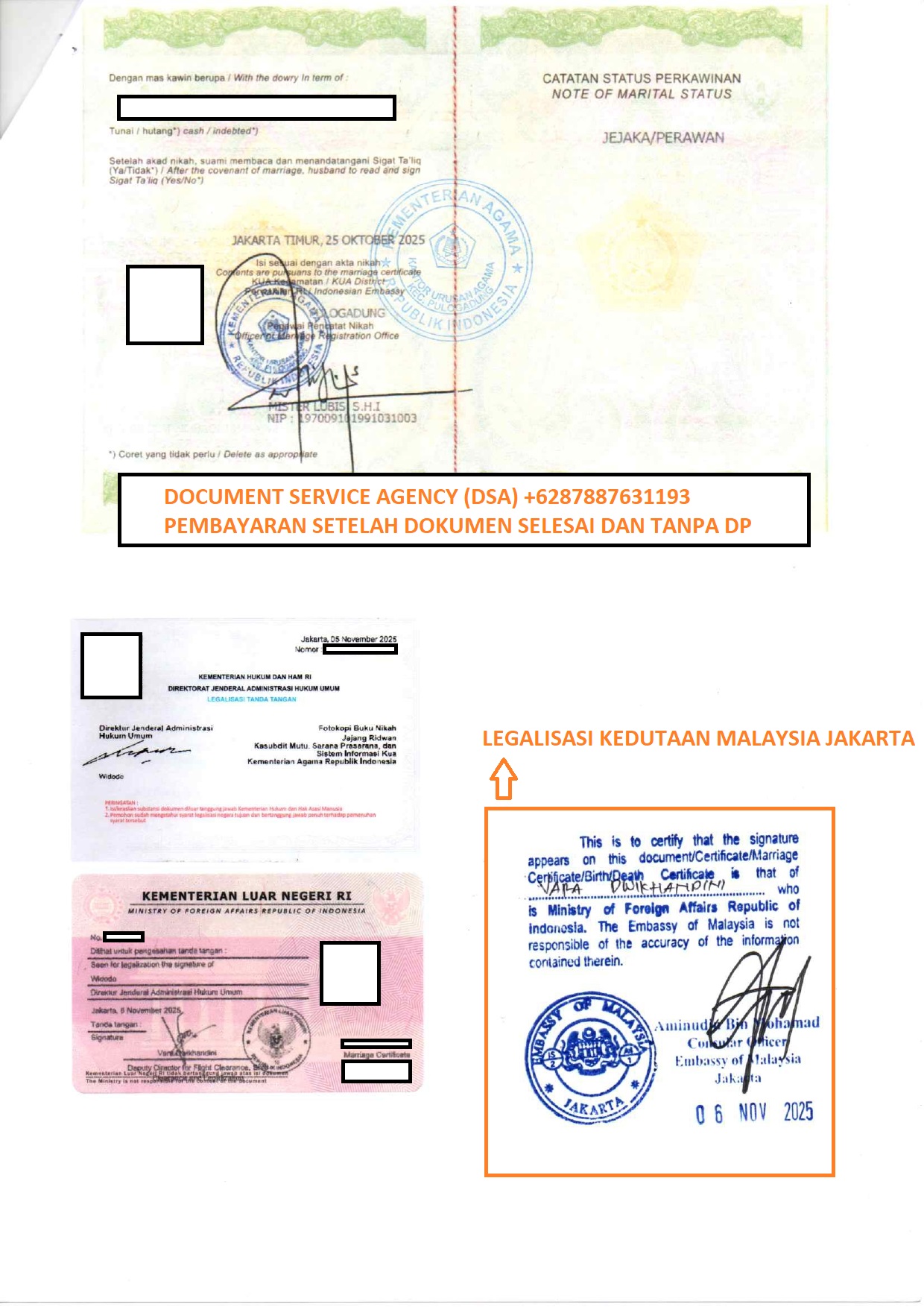 DSA (Document Service Agency) adalah spesialis jasa terjemah, legalisir, atestasi, apostile dokumen untuk keperluan di luar negeri dan pengurusan visa berpengalaman dan terpercaya. Bagi anda yang ingin melegalisir buku nikah di Kedutaan Malaysia untuk keperluan pengurusan visa, izin tinggal, pendaftaran pernikahan dan lain-lain. Anda tidak perlu datang ke Jakarta karna pengurusan dokumen anda bisa diwakilkan kepada kami, dengan layanan ” Pembayaran Setelah Dokumen Selesai dan Tanpa DP ” membuat anda lebih nyaman dan aman menggunakan jasa kami.