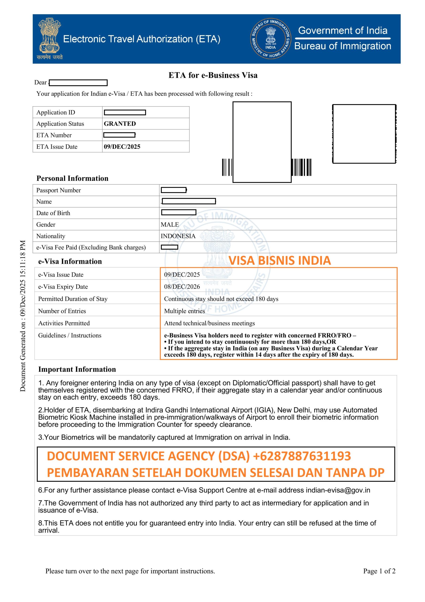 DSA (Document Service Agency) adalah spesialis jasa terjemah, legalisir, atestasi, apostile dokumen untuk keperluan di luar negeri dan pengurusan visa berpengalaman dan terpercaya. Bagi anda yang ingin mngurus visa di Kedutaan India untuk keperluan liburan, bisnis, bekerja dan lain-lain. Anda tidak perlu datang ke Jakarta karna pengurusan visa anda bisa diwakilkan kepada kami, dengan layanan ” Pembayaran Setelah Dokumen Selesai dan Tanpa DP ” membuat anda lebih nyaman dan aman menggunakan jasa kami.